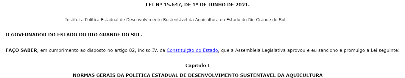 > Normas Gerais Desenvolvimento Sustentável da Aquicultura/RS - Lei 15.647/2021